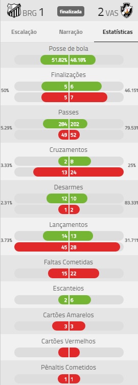 Confira estatísticas de Bragantino 1 x 2 Vasco