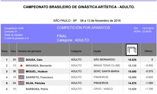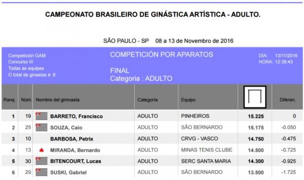 No último aparelho masculino, a barra fixa, Chico, do Pinheiros (SP), foi ouro com 15,225, Caio, da ADC São Bernardo (SP), foi prata somando 15,175, e Petrix Barbosa, do Vasco da Gama (RJ), foi bronze com 14,750.