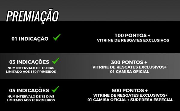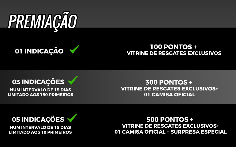 Todos os sócios-torcedores que realizarem indicação com adesão concluída (pagamento realizado) receberão prêmios e terão acesso a uma vitrine de prêmios exclusiva desta campanha, no Clube de Vantagens do Gigante, após o término do prazo estabelecido. Confira a premiação: