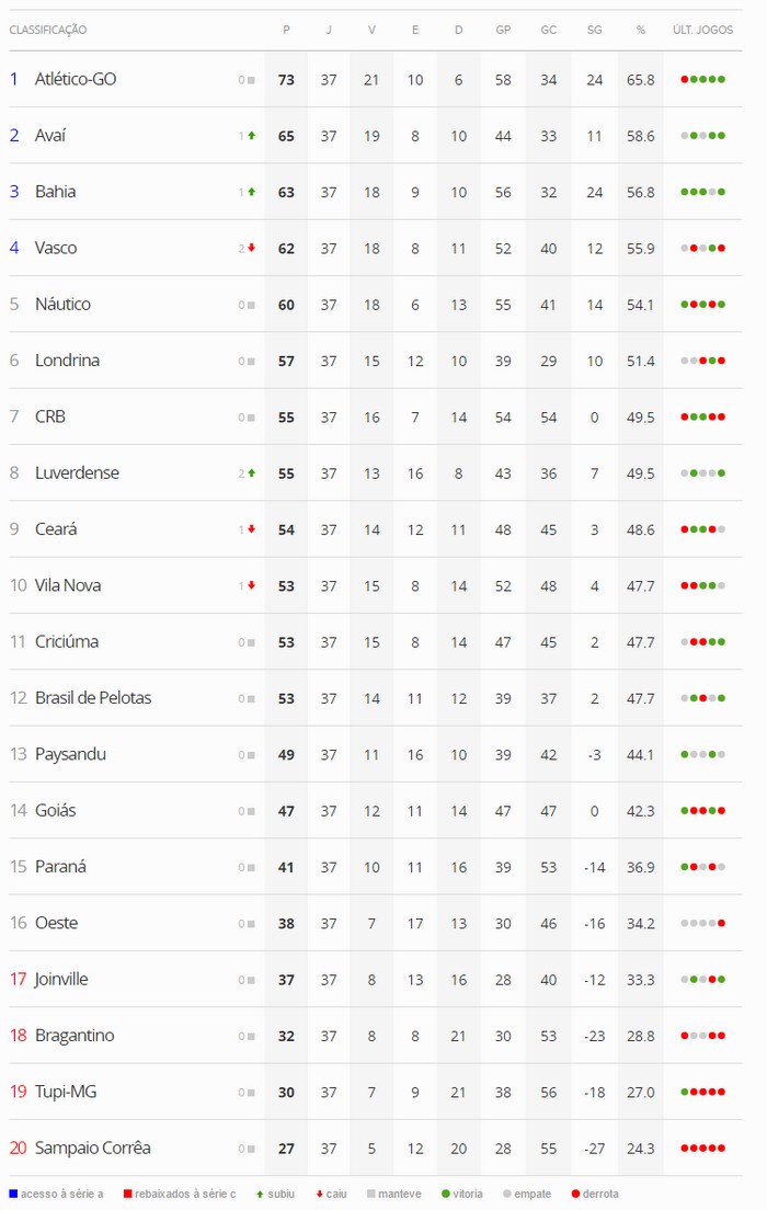 Atlético-GO e Avaí garantiram matematicamente o acesso para a Série A. Sampaio Corrêa, Tupi e Bragantino estão matematicamente rebaixados para a Série C.