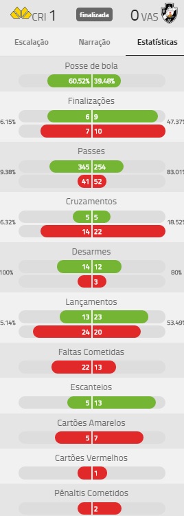Confira estatísticas de Criciúma 1 x 0 Vasco