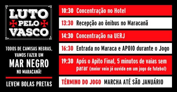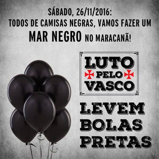 O grupo se diz de luto pelo Vasco e pede que a torcida vá ao Maracanã vestido de preto para fazer um “mar negro” de protesto. Ao todo, a manifestação está marcada para ter seis atos, começando antes da bola rolar e terminando só após o jogo.