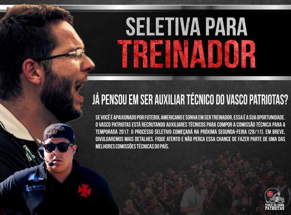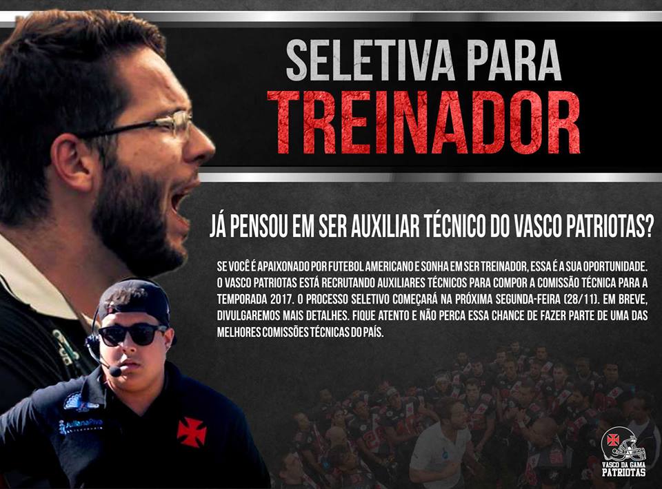 Se você é apaixonado por futebol americano e sonha em ser treinador, essa é a sua oportunidade. O Vasco Patriotas está recrutando auxiliares técnicos para compor a Comissão Técnica para a temporada 2017. O processo seletivo começará na próxima segunda-feira (28/11). Em breve, divulgaremos mais detalhes. Fique atento e não perca essa chance de fazer parte de uma das melhores comissões técnicas do país.