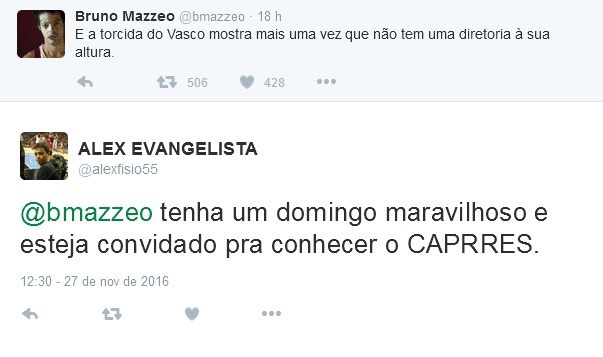 Alex Evangelista responde crítica do humorista vascaíno Bruno Mazzeo convidando-o para conhecer o Caprres