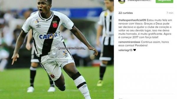 Thalles recebeu a notícia que tanto esperava nesta quarta-feira, ao acertar a renovação do contrato com o Vasco por mais três anos. O atacante, destaque da partida que levou o time de volta à Primeira Divisão, festejou o final feliz das negociações com uma mensagem publicada em sua conta no Instagram.