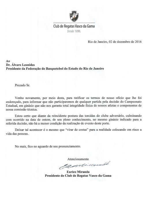 O Presidente Eurico Miranda enviou à Federação de Basquete do Rio de Janeiro um ofício reforçando a decisão de não disputar a final do Campeonato Carioca de Basquete no Ginásio do Tijuca.