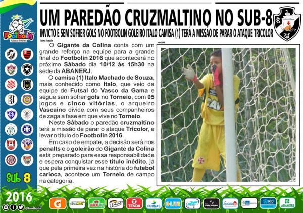Final do Footbolin Sub-8 entre Vasco e Fluminense será no sábado às 17h; goleiro Italo está invicto