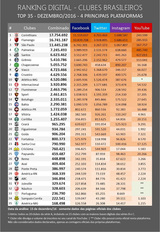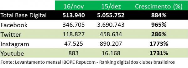 Sua página no Facebook registrou um crescimento de quase 1.000% em relação à última contagem em novembro, acumula quase 3,7 milhões de curtidas e é a quinta maior entre os clubes. Já a conta oficial no Instagram registrou crescimento de mais de 1.700% em relação a novembro, e se tornou a quarta maior do país entre os clubes, maior inclusive que a conta oficial do Palmeiras, clube com uma das maiores torcidas do Brasil e campeão brasileiro de 2016.