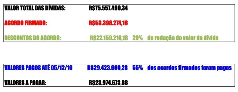 Eurico agora mostra os acordos extrajudiciais. Veja a tabela que o presidente transmite do telão da sala de entrevistas.