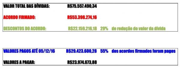 Pela primeira vez foram mostrados detalhes da dívida herdada e tudo o que já foi pago. Até 5 de dezembro foram pagos mais de 162 milhões de reais ( R$162.701.817,00) de dívidas da gestão anterior: " Foram assinadas dezenas de confissões de dívida que não nos deixam margem de discussão na Justiça. Isso nos obrigou a fazer acordos para que não tivéssemos todas as receitas penhoradas. E acordo tem que pagar. Eles antes até faziam acordos, mas não pagavam e a dívida se multiplicava ", explicou Eurico.