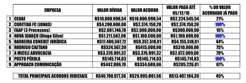 Há também uma dívida do Vasco com a Cedae, de cerca de R$ 10 milhões, e de R$ 2,3 milhões contra o Coritiba pela contratação de Jonas, que move um processo trabalhista no qual é credor de R$ 4,7 milhões.
