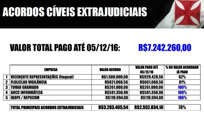 Entre outros números mostrados em um dossiê nomeado "Realidade financeira" pelo clube, está descrito que o Vasco pagou 55% dos seus acordos judiciais firmados.