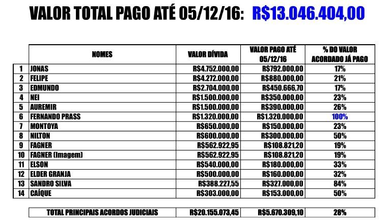 Em nota, a gestão de Eurico alega ter pago pelos jogadores Fernando Prass, Jonas, Fagner, Montoya, Elder Granja, Sandro Silva, Nei, Auremir, Edmundo, Felipe, "entre outros". E também reforça o pagamento na Fifa dos direitos sobre Éder Luís, de quase R$ 12 milhões, e outros.