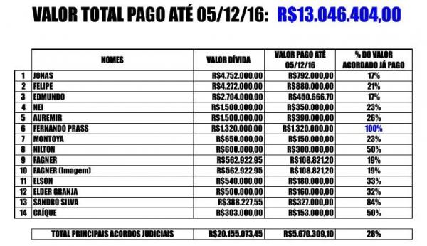 De salários atrasados e tributos e encargos de 2014, Eurico diz que a gestão pagou R$ 18.548.184,00".