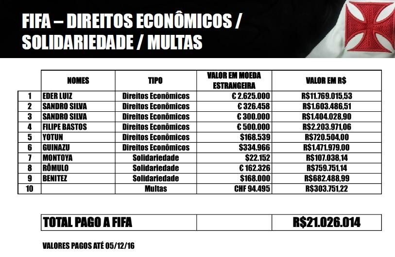 Tabela com os valores pagos por jogadores divulgado em documento nomeado "A realidade financeira". Eurico Miranda fará balanço de gestão em coletiva que deve começar a qualquer momento.