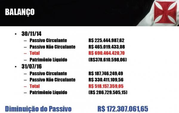 De um passivo de 690 milhões de reais em 30 de novembro de 2014 (fim da gestão anterior) passou-se a um passivo de 518 milhões de reais na metade do atual ano. O dirigente considerou catastrófica a situação herdada e disse que o clube se encontrava a beira da insolvência no fim de 2014: "O Vasco precisava e precisa do mínimo para poder se desenvolver no dia a dia. Então, além da locomoção, dos campos, tinha aluguel de outros campos que não era pago. O gramado, a empresa que fazia não recebia, como também a água era cortada. Fomos obrigados a fazer os acordos. Trocando em miúdos, hoje pagamos duas contas d'água. Se a gente demora mais um pouco para chegar, dificilmente conseguiríamos recuperar essa instituição", disse.