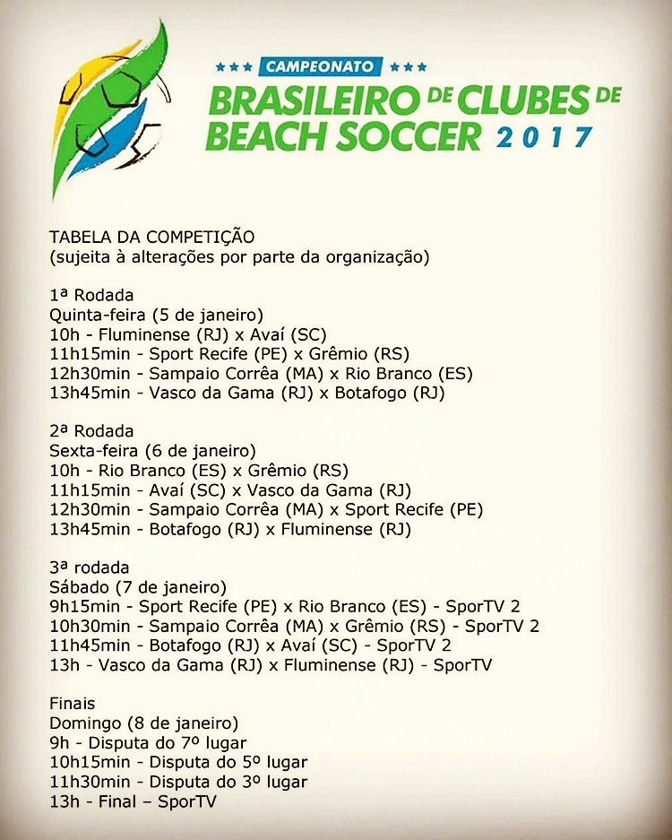 CBSB @BrBeachSoccer Confira a tabela do Campeonato Brasileiro, que será realizado entre 5 e 8 de janeiro, na praia do Gonzaga, em Santos. #BeachSoccerBrasil