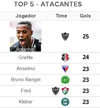 O ranking dos atacantes é, também, um recorte da ponta do compilado geral do Prêmio Friedenreich. Ou seja, a liderança e suas redondezas ficaram na mão dos homens lá da frente. Robinho distribuiu seus gols por quatro campeonatos: 12 na Série A, nove no Mineiro (do qual foi artilheiro, com direito a dois hat-tricks), três na Copa do Brasil e mais um na Taça Libertadores.