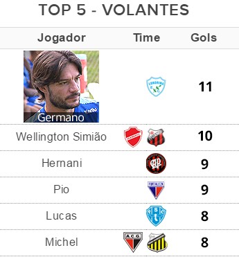 E o Germano, hein? Sempre se notabilizou pela força - às vezes até exagerada - nas divididas... Esse ano resolveu mostrar a que veio balançando o barbante. Foram 11 gols, sendo nove ao longo da Série B - e desses, seis foram de pênalti. Foi um dos grandes nomes da boa campanha do Londrina, que terminou em sexto e lutando até as últimas rodadas pela vaga na elite.