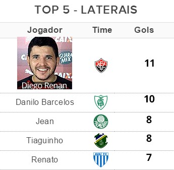 Aqui a maioria é conhecida do grande público, e a novidade fica por conta da ausência de Yago Pikachu, que ganhou com certa folga nos anos anteriores. Com menos chances no Vasco, teve que passar o bastão. Diego Renan atua em ambas as laterais e puxa a fila, com 11 gols no currículo pelo Vitória. Batedor de pênalti da equipe - revezando com Marinho em alguns jogos - fez nove gols da marca da cal.