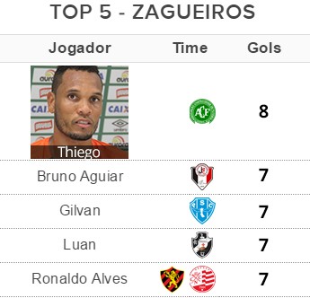 Bruno Aguiar divide a vice-liderança com mais quatro jogadores. O zagueiro ex-Joinville - negociou sua ida para o Catar - marcou sete gols durante a disputa do Catarinense. Gilvan, Luan e Ronaldo Alves, do Náutico, também disputaram a Segundona por Paysandu, Vasco e Náutico, respectivamente. Ronaldo Alves, no entanto, acertou sua ida para o Sport no meio da temporada, terminando o Brasileirão como titular ao lado de Matheus Ferraz. Marcou um gol pelo Leão pernambucano.