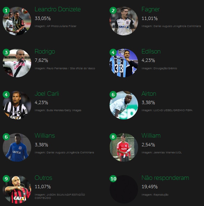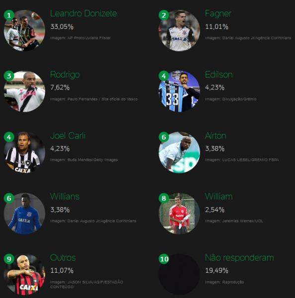 O índice de Leandro Donizete em 2016 é praticamente o dobro do percentual que lhe deu a "vitória" neste quesito na edição de 2015 do Pesquisão. No ano anterior, o jogador do Atlético-MG fora eleito o mais violento com 17,4% dos votos.