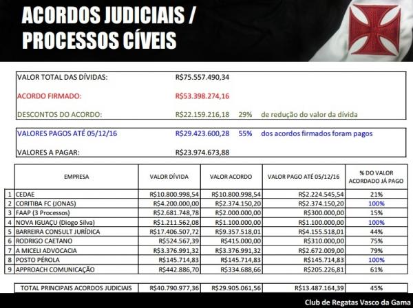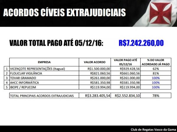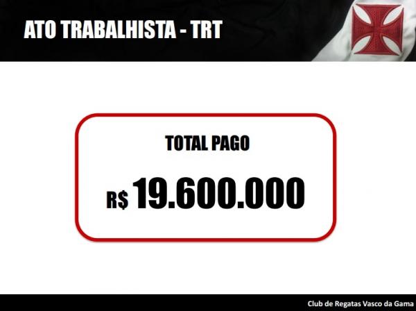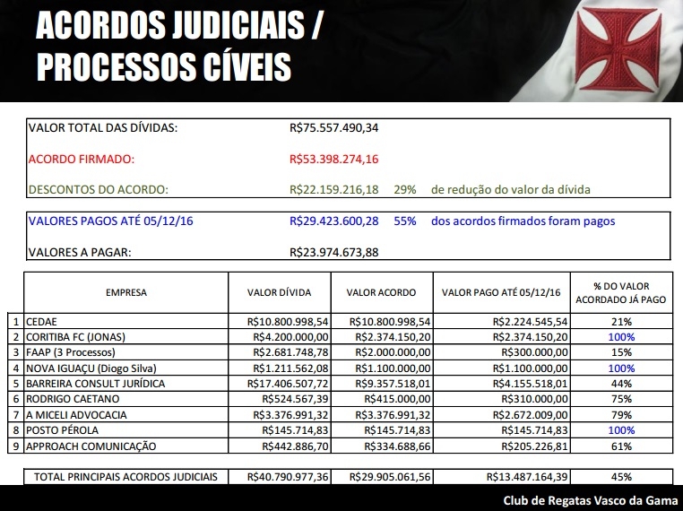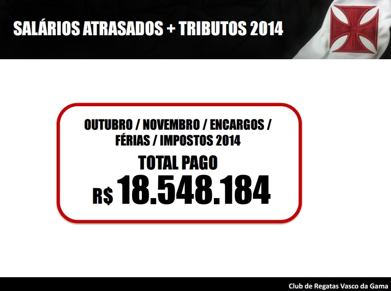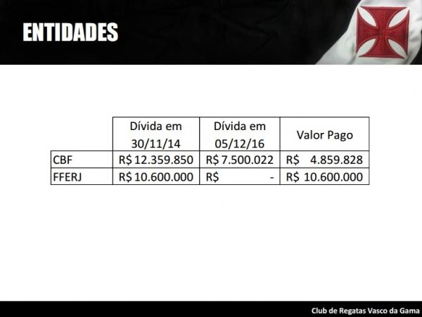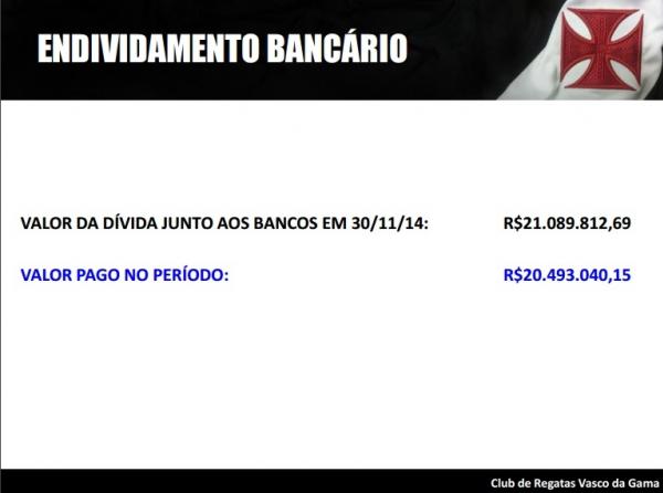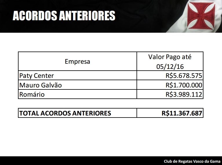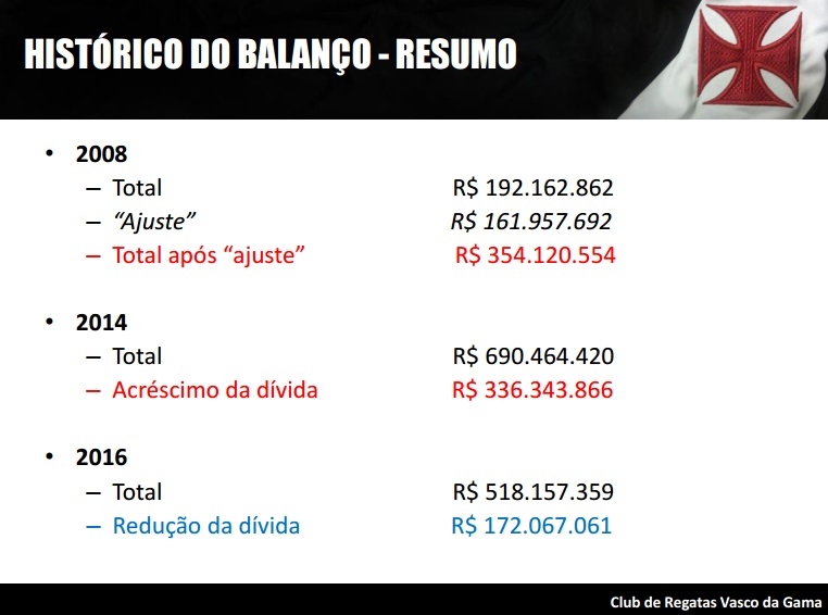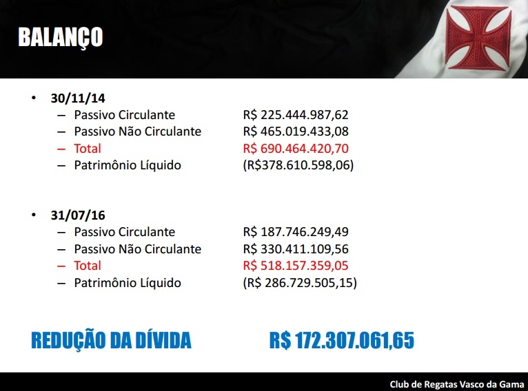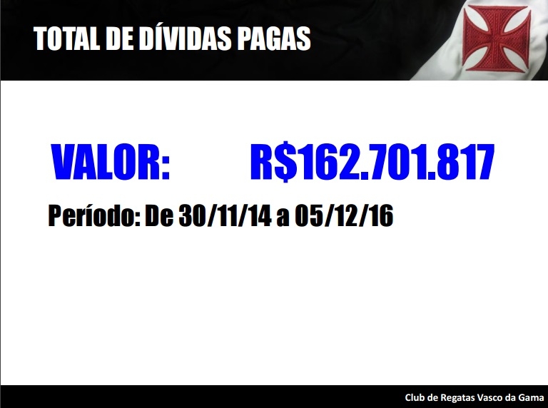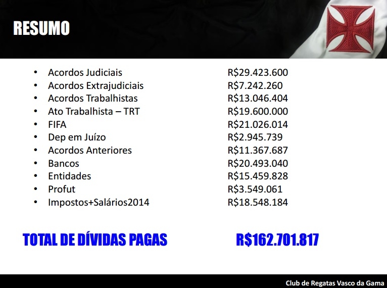 A seguir foi feita a exposição da delicada situação financeira deixada e mostrado o pagamento de 162 milhões de reais em dívidas em apenas dois anos. Abaixo, você pode conferir o material apresentado aos conselheiros.