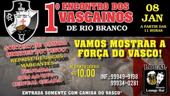 A torcida organizada do Vasco da Gama no Acre, formada em parceria da Força Jovem AC, 44ª Família e a União Cruzmaltina, promove neste domingo (8), o 1º Encontro de Vascaínos de Rio Branco, a partir das 8h, na Diretoria Lounge Bar, em Rio Branco. A venda dos ingressos será limitada. A reserva de cadeiras custa R$ 10 e deve ser feita através dos contatos disponíveis no banner do evento (confira na imagem ao lado).