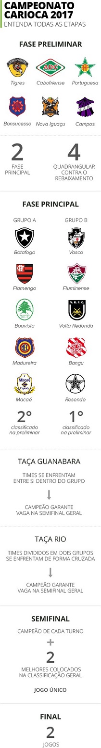 Com novo formato aprovado no dia 1º de novembro do ano passado, o Carioca começará nesta quarta-feira para seis equipes de menor investimento. Segundo o novo regulamento, Tigres do Brasil, Portuguesa, Bonsucesso, Cabofriense, Nova Iguaçu e Campos farão uma seletiva para definir os dois times que conseguirão vaga na fase principal do estadual, que terá início no dia 29 de janeiro, e as quatro equipes que irão lutar contra o descenso - duas delas serão rebaixadas.