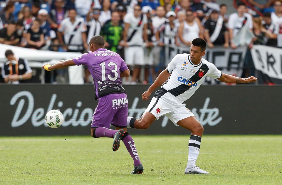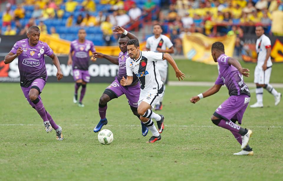 Aos 39 minutos, o Vasco quase desempatou em chute de Escudero, de fora da área, mas o goleiro Banguera desviou para escanteio. O jogo seguiu disputado com faltas violentas se sucedendo, principalmente por parte da equipe equatoriana, o que motivou reclamações dos jogadores do Vasco após o encerramento do primeiro tempo.