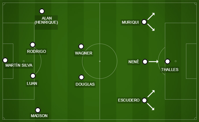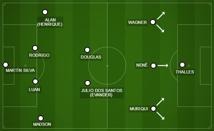 Na teoria, uma linha com Muriqui, Nenê e Wagner dá força ofensiva, com os pontas cortando para dentro para finalizar – pontos fortes de ambos. Mas falta velocidade e profundidade, que devem ser providenciadas pelos laterais.