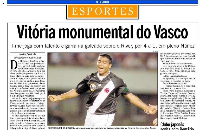 ![]() Jornal O Globo destaca goleada cruzmaltina no Monumental em 2000 |