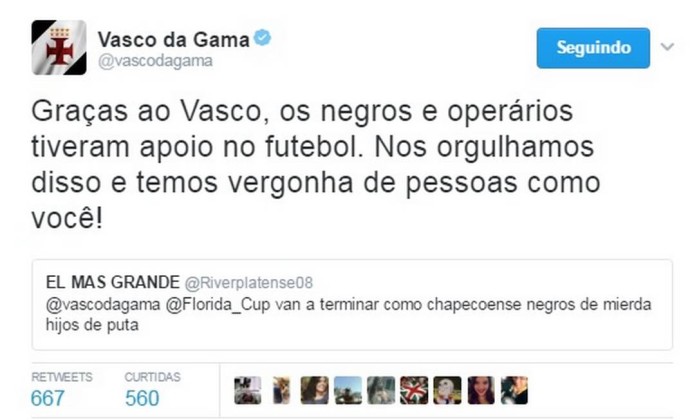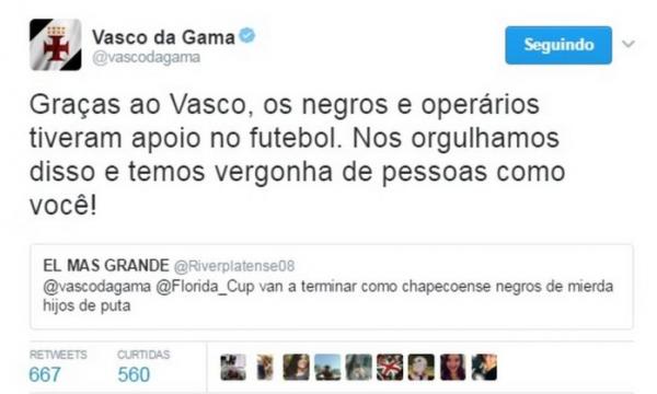 Graças ao Vasco, os negros e operários tiveram apoio no futebol. Nos orgulhamos disso e temos vergonha de pessoas como você'.