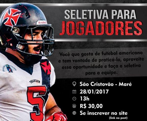 Já pensou em jogar no Vasco Patriotas? Então, essa é a sua chance de fazer parte de um dos times mais vitoriosos do Futebol Americano no Brasil. Faça a sua inscrição agora mesmo no link abaixo. O tryout (seletiva de jogadores) vai ser neste sábado, 28/01, das 13h às 18h, na Sede Náutica do São Cristóvão FC (Avenida Brigadeiro Trompowski, 580). A inscrição custa R$ 30 e será paga no dia do tryout, apenas em dinheiro.