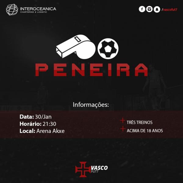 A peneira começa na próxima segunda feira, dia 30 de Janeiro, na Arena Akxe, Barra da Tijuca, local dos treinos do Vasco Fut7. Serão três treinos, dia 30/01, dia 01/02 e 03/02 e os atletas serão avaliados por toda a Comissão Técnica do #Expresso7.
