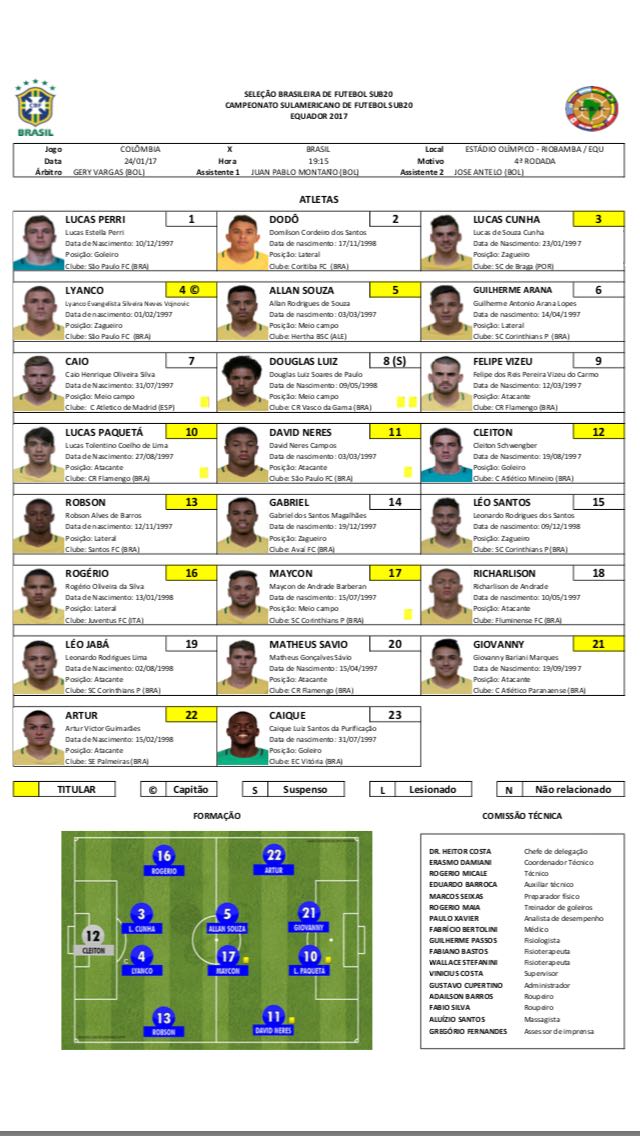 Brasil: Cleiton; Robson (Dodô), Lyanco, Lucas Cunha, Rogério; Allan Souza, Maycon, Lucas Paquetá (Léo Jabá) e Giovanny; David Neres e Artur (Matheus Sávio).