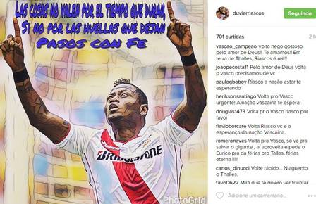 A derrota por 3 a 0 para o Fluminense deixou a torcida do Vasco preocupada. E, no desespero, muitos torcedores foram atrás de um velho conhecido: Riascos. Uma postagem do atacante colombiano no Instagram logo após o jogo foi invadida por pedidos de cruz-maltinos para que volte ao time de São Januário.