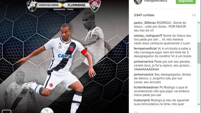 A derrota por 3 a 0 para o Fluminense no primeiro clássico do ano deixou os torcedores do Vasco revoltados. Um dos alvos dos vascaínos foi o zagueiro Rodrigo. Na última postagem do defensor no Instagram, justamente uma chamada para o jogo que aconteceu no domingo, pelo Campeonato Estadual do Rio, os torcedores deixaram inúmeros comentários, mas o conteúdo se resumia a uma simples frase: “Pede para sair”.