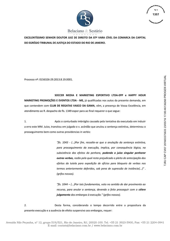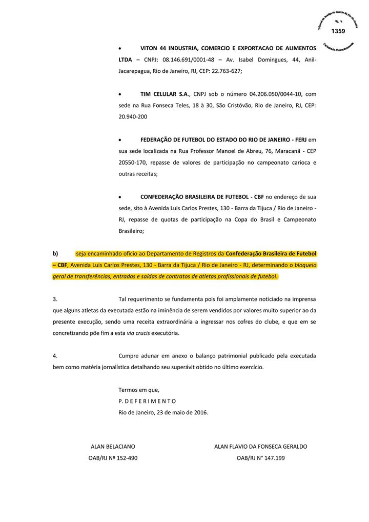 Ora, basta ler o processo, ao lado, para ver que um dos advogados que assina a peça onde se pede explicitamente que "seja encaminhado oficio ao Departamento de Registros da Confederação Brasileira de Futebol – CBF, Avenida Luis Carlos Prestes, 130 - Barra da Tijuca / Rio de Janeiro - RJ, determinando o bloqueio geral de transferências, entradas e saídas de contratos de atletas profissionais de futebol" (vejam na alínea B da página 3) é Alan Belaciano, dirigente do grupo Sempre Vasco, de Júlio Brant.