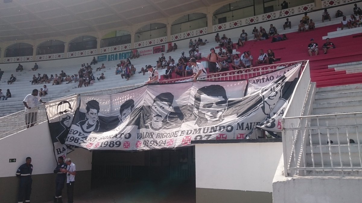 David Nascimento @daviddcn Torcedores colocam faixa de homenagem a grandes jogadores da história do Vasco no setor atrás do gol aqui em São Januário #lanceCOLINA