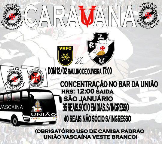 Nós da Torcida União Vascaína convocamos todos integrantes e simpatizantes para nossa caravana no dia 12/02 para Volta Redonda. Vamos empurrar o Gigante da Colina no rumo de mais uma Vitória em busca do Tri ! /+/