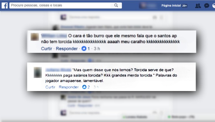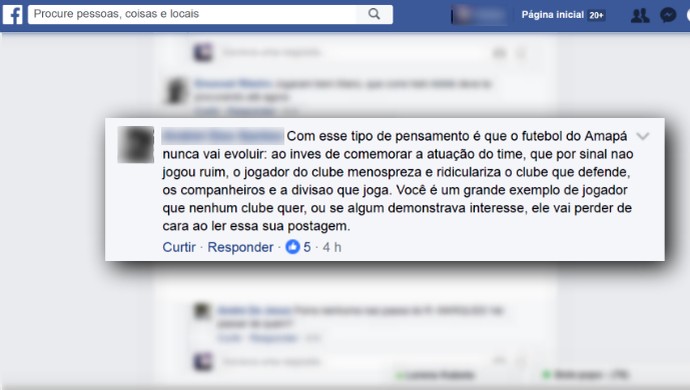 - Com esse tipo de pensamento é que o futebol do Amapá nunca vai evoluir: ao invés de comemorar a atuação do time, que por sinal não jogou ruim, o jogador do clube menospreza e ridiculariza o clube que defende, os companheiros e a divisão que joga. Você é um grande exemplo de jogador que nenhum clube quer, ou se algum demonstrava interesse, ele vai perder de cara ao ler essa sua postagem (sic) - criticou.