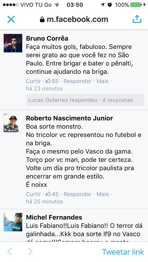 Gilmar Ferreira @gilmarferreira Torcedores do São Paulo esquecem a rivalidade e desejam sorte a Luís Fabiano no Vasco, em comentários no perfil do jogador no facebook.