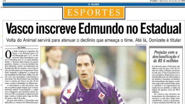 Na ocasião, o Vasco, então detentor do título da Libertadores, flertava com uma crise. O time fora derrotado na final da Taça Guanabara para o rival Flamengo e, em seguida, deu adeus à defesa da taça e acabou eliminado nas oitavas de final da competição sul-americana pelo Palmeiras. Eurico Miranda, então vice de futebol, sacou a contratação de Edmundo da manga. A dois dias do prazo final da inscrição no Estadual, o dirigente inscreveu Edmundo na Federação de Futebol do Rio de Janeiro (Ferj), à época ainda sob a gestão de Eduardo Viana, o Caixa D’água.