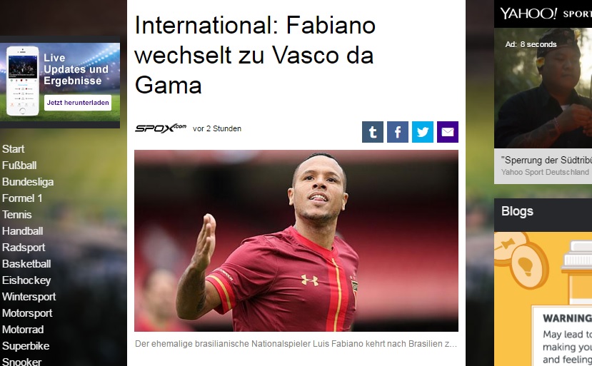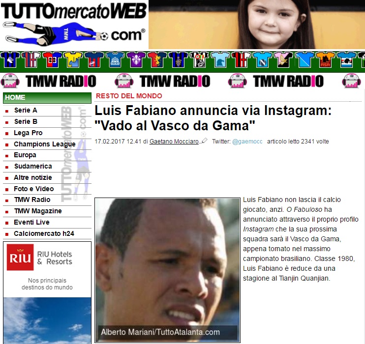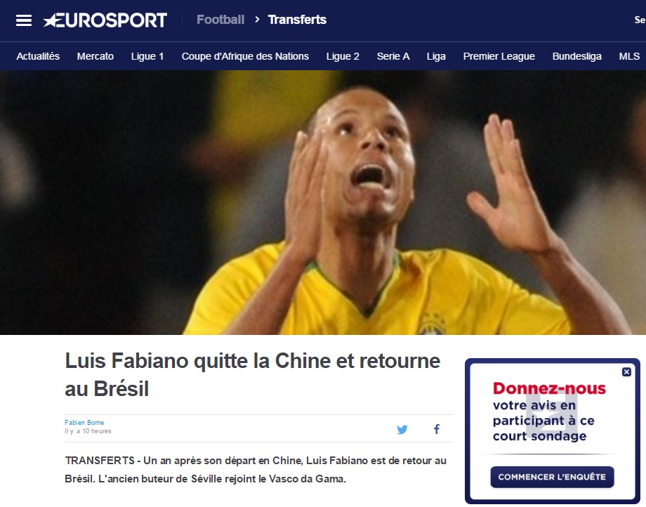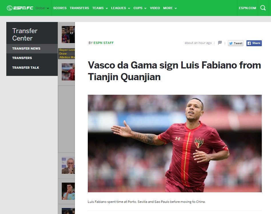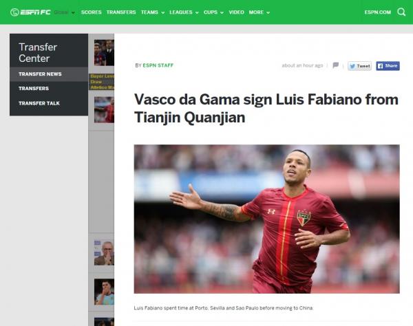 Contratação de Luis Fabiano pelo Vasco repercute no exterior