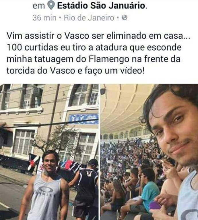 Um suposto torcedor do Flamengo causou confusão na arquibancada de São Januário, durante a partida entre Vasco e Portuguesa, neste sábado, pelo Campeonato Carioca. Ele postou em suas redes sociais que estava no estádio e fez uma promessa: se recebesse 100 curtidas na foto, mostraria uma tatuagem do Rubro-Negro. Vascaínos viram a postagem, o encontraram e o agrediram, mas a polícia interveio rápido.