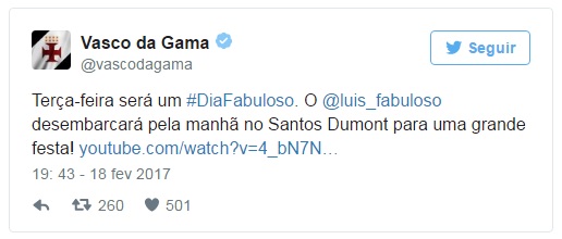 A torcida do Vasco está empolgada com a contratação de Luís Fabiano. E a chegada do atacante ao Rio de Janeiro será uma autêntica festa cruzmaltina. A vitória do time por 1 a 0 sobre a Portuguesa, sábado (18), em São Januário, foi marcada também pela convocação do clube para que os torcedores promovam uma recepção de gala ao jogador.