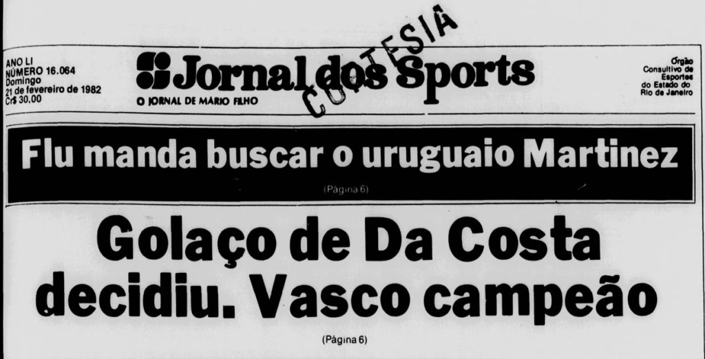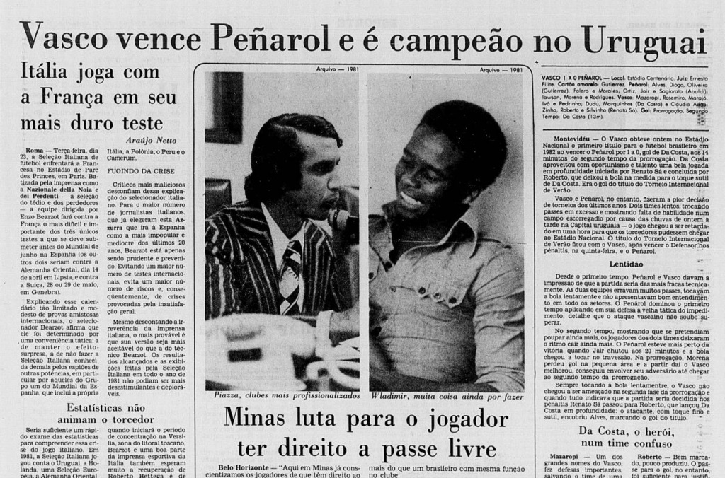 “O Vasco obteve ontem no Estádio Nacional o primeiro titulo para o futebol brasileiro em 1982 ao vencer o Peñarol por 1 a 0, gol de Da Costa, aos 14 minutos do segundo tempo da prorrogação. Da Costa aproveitou com oportunismo e talento uma bela jogada em profundidade iniciada por Renato Sá e concluída por Roberto, que deixou a bola na medida para o toque sutil de Da Costa. Era o gol do titulo do Torneio Internacional de Verão.”