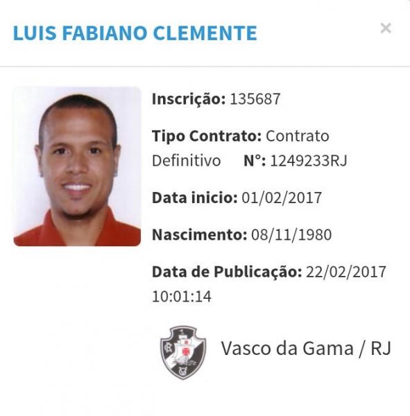 David Nascimento @daviddcn Luis Fabiano está regularizado! Acabou de ser publicada no Bid da CBF a sua regularização pelo Vasco. Olhe aí! #lanceVAS