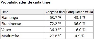 Ainda segundo o Chance de Gol, o Vasco tem 16,0% de chance de se sagrar campeão da Taça Guanabara.